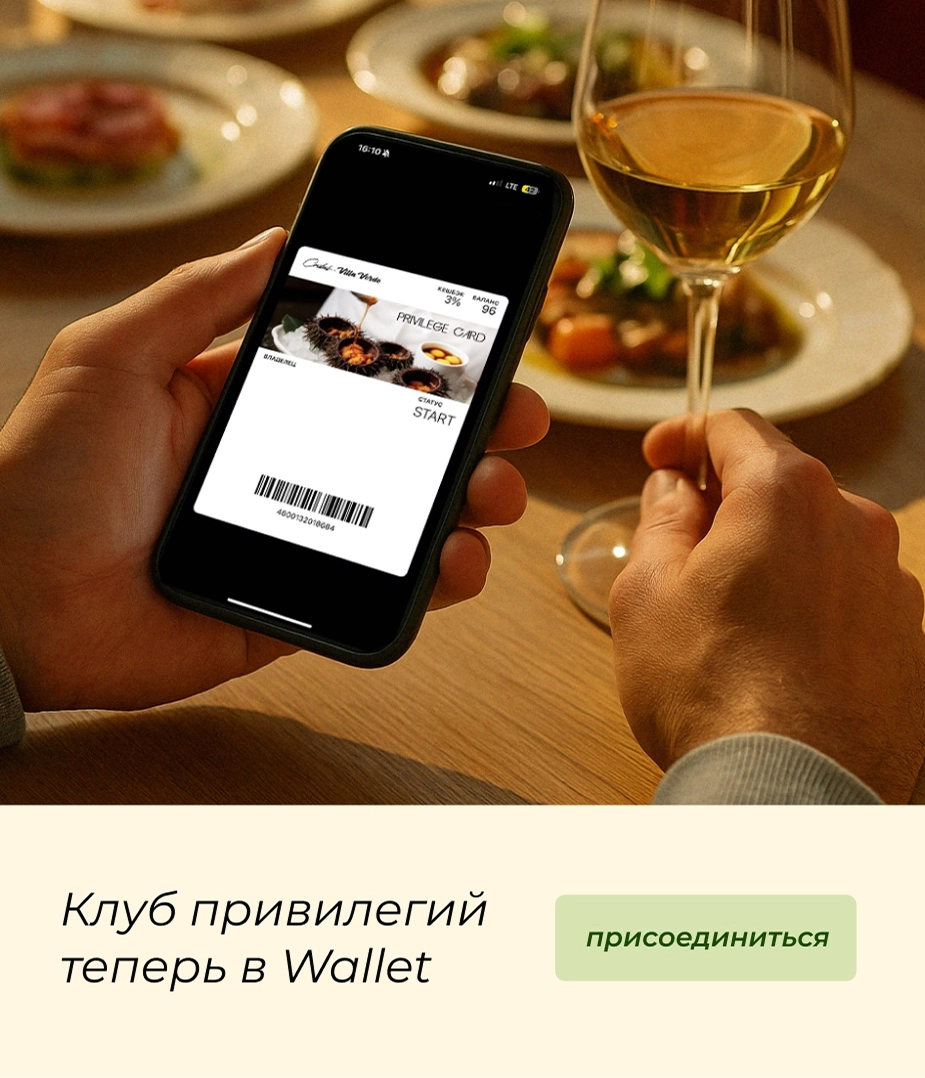 Программа лояльности CRISTAL и VILLA VERDE переходит в Wallet, электронный кошелёк в Вашем смартфоне. Пользуйтесь общим бонусным счётом в двух ресторанах: предъявляя клубную карту при каждом посещении, Вы сможете копить бонусы и оплачивать ими до 90% от суммы счёта.