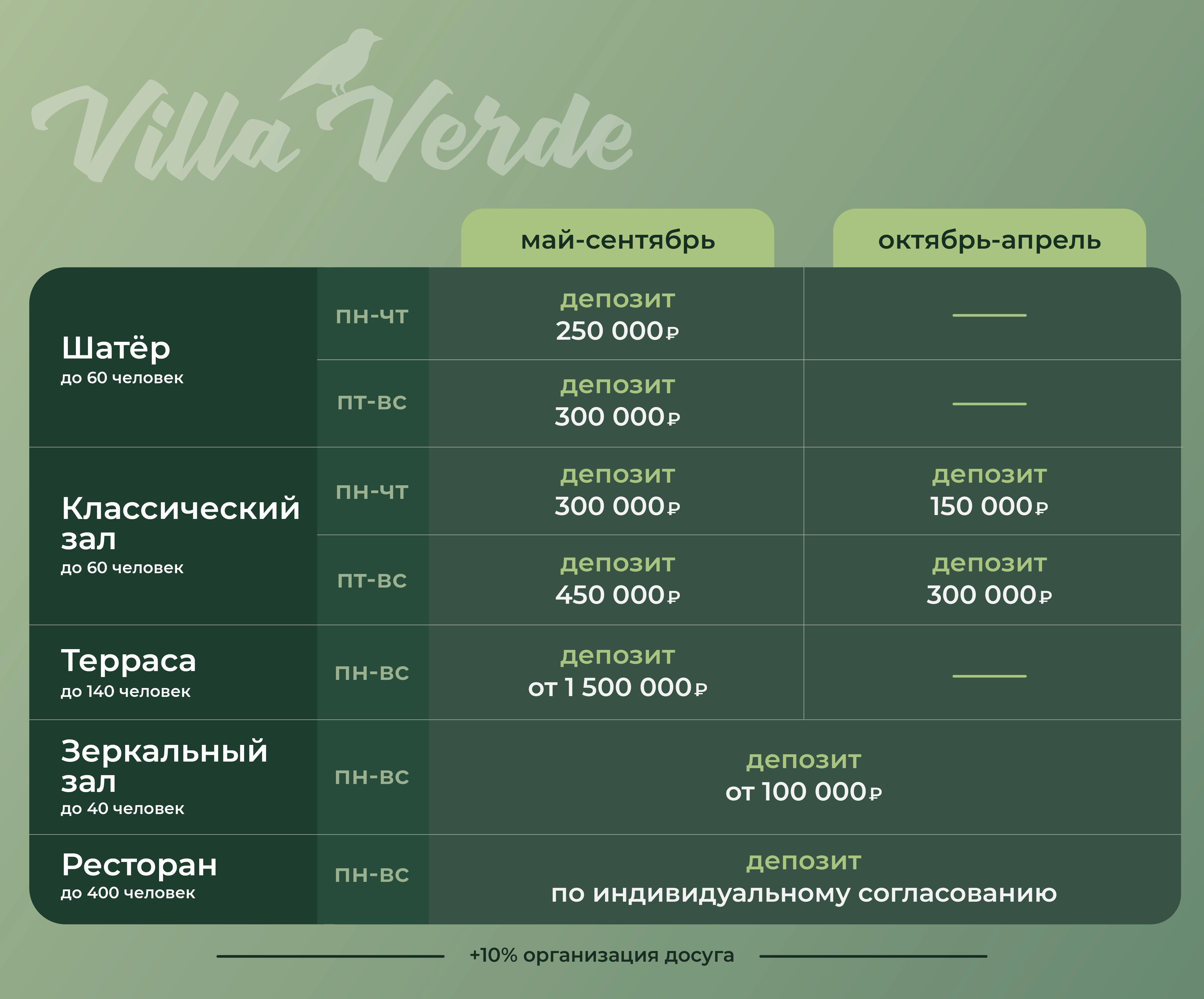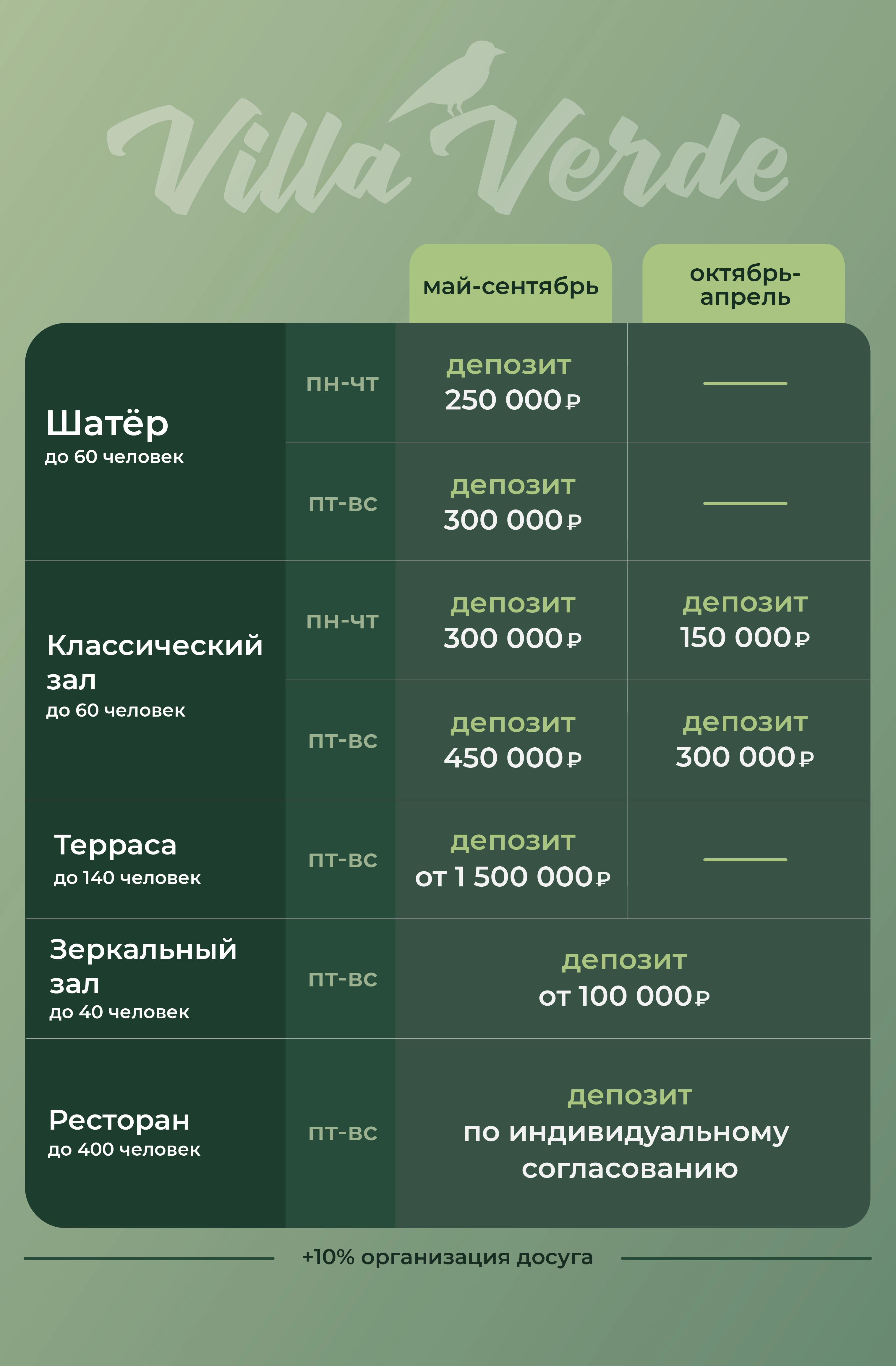 В летнее время лучшим решением для организации мероприятия станет терраса или белоснежный шатёр на пляже ресторана Villa Verde — идеальный фон для Вашего праздника.